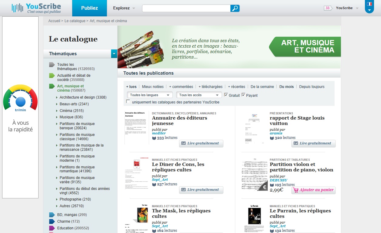 Vous trouverez sur ce site aussi bien la notice du lave-vaisselle que vous avez égarée, des modèles de CV si vous cherchez un emploi, les répliques cultes du film “Le Dîner de cons” pour  les férus de cinéma, des recettes de cuisine asiatique pour les gourmands, ou des partitions de piano pour les musiciens. Et tout ça gratuitement ou à des prix abordables. Amateurs de romans, vous pourrez aussi y découvrir le premier livre d’un inconnu (qui sera peut-être célèbre demain, vous pourrez alors vous vanter auprès de vos amis “Moi je l’ai découvert avant tout le monde sur Youscribe” !) ou des livres déjà devenus des best-sellers, puisque beaucoup de grands éditeurs comme Gallimard, Flammarion, ou les éditions du Seuil sont présents sur Youscribe.