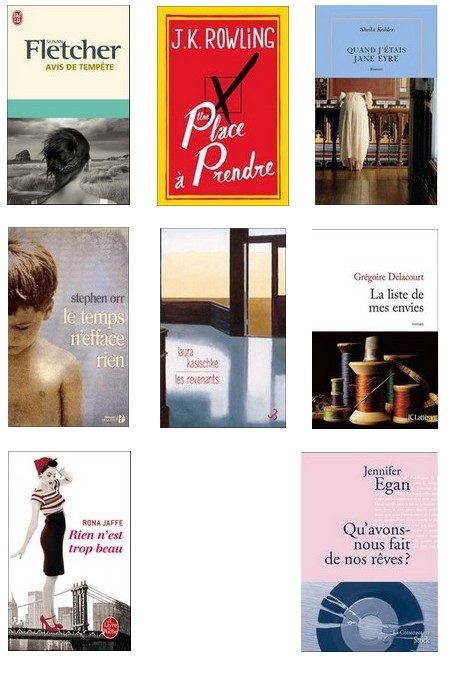 Du côté des romans pour adultes: Avis de tempête de Susan Fletcher, Une place à prendre de J.K Rowling, Quand j’étais Jane Eyre de Sheila Kohler, Les revenants de Lara Kasischke, Le temps n’efface rien de Stephen Orr .